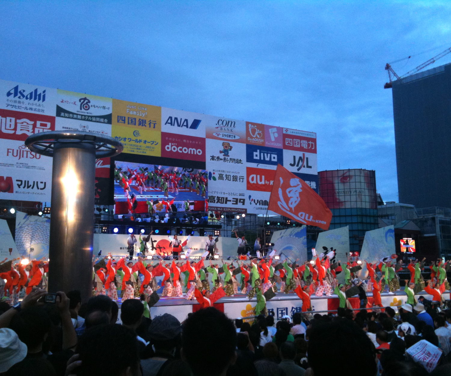 今シーズンが始まるずっと前から、國士舞双代表の森田氏はこの「みちよさ」に出ることを決めていらっしゃいました。 よさこいは高知が発祥の地。復興祈念が柱となるこの年に、本場の高知からもっと多くの参加があればと思うのですが、実際には交通事情でそうは簡単にいかないのが本当のところ。 高知 - 仙台の直通の交通手段がないため、移動費用だけで多額になる訳です。しかしそれを推して実現させ、55名もの踊り子を引き連れて今年のみちよさに出場した氏の行動力に敬意を表します。 今年のテーマ「千喜乱舞」は、戦記ともかかっていて、実際ストリートで演舞を見ていた他チームの方が『千の喜びでこの曲の出だしなんだ』と言っておられましたが、まさにその通り! 「戦い」に寄り添う「悲しみ」を描いた今年の作品。不安〜希望〜喜びを盛り込んだこの曲は、大震災などありえない中で作っていたわけで、しかし今となれば1000年に一度の災いの年に、お祭りの曲としてこれを作らせてもらえたのは、間違いなく運命だなぁと感じております。 2011 高知よさこい祭りより 高知から東京経由で1300kmを往復したチームの皆さん、たいへんお疲れさまでした! もう聞き慣れたと思っていた鳴子の音が、この仙台で一斉に鳴り響いた瞬間は、本当に感動しましたよ。 きっとそのパワーはお客さんに伝わって、仙台の、東北の皆さんとの絆をより強く結んでくれたことと思います、ありがとう!!