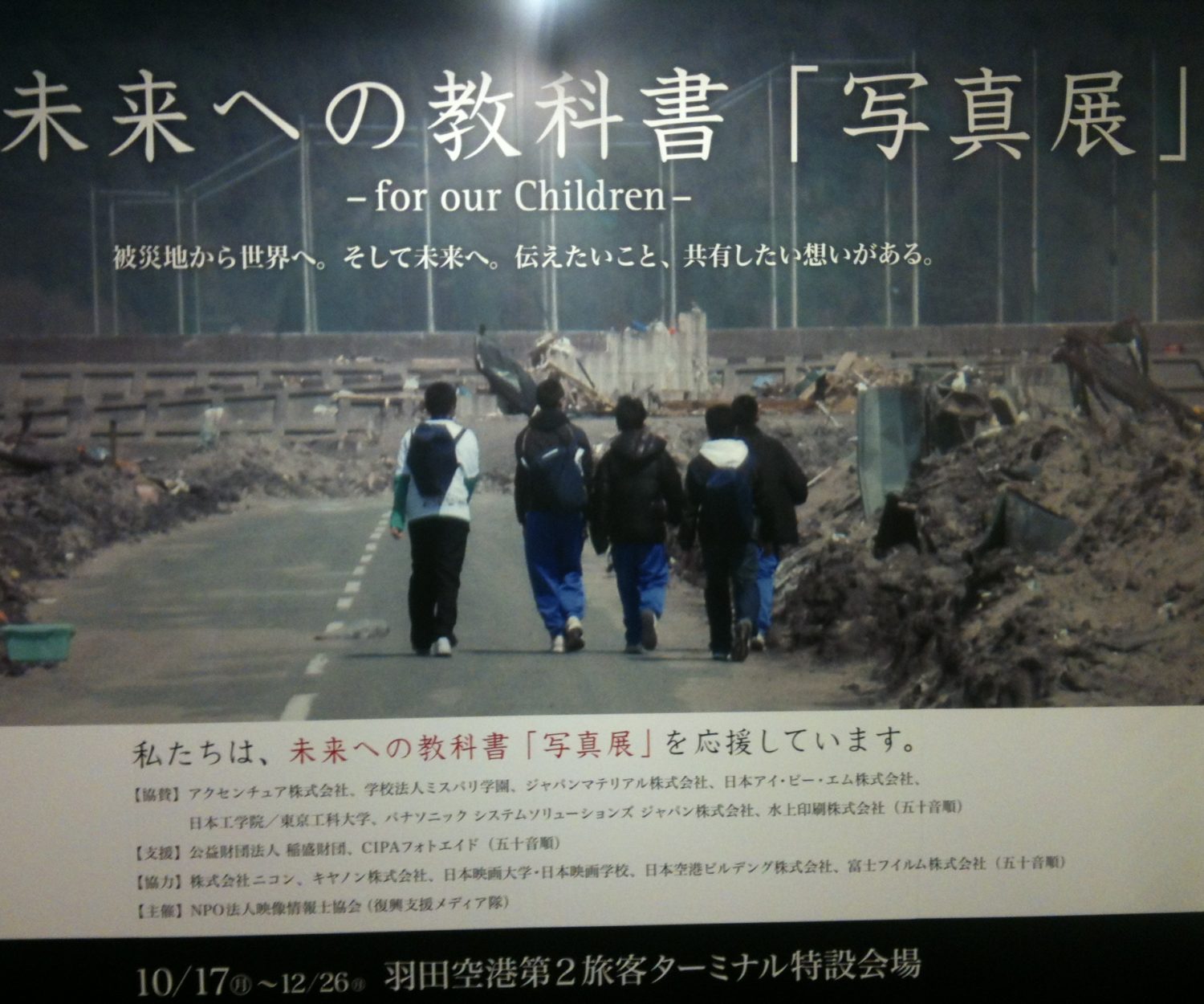 羽田空港のANA系の搭乗口(第二ターミナル)内で開かれている ”未来への教科書「写真展」” 写真とそのコピーがとってもいい… 一枚一枚に場所と説明が書いてあります。 最後の写真 『去年、生徒がちょっぴりいたずらして落書きをしたら地域の方が激怒し、お詫びに生徒と職員で塗った。これだけは残った。』 ブルーに塗られた壁には「美しい海を輝く未来を」と… そうなんだよね、日常だったんだよね。 空港で涙が出そうになった。 地味な展示でしたが、まだまだたくさん写真あります。 今月26日まで、空港から出発の方は是非!
