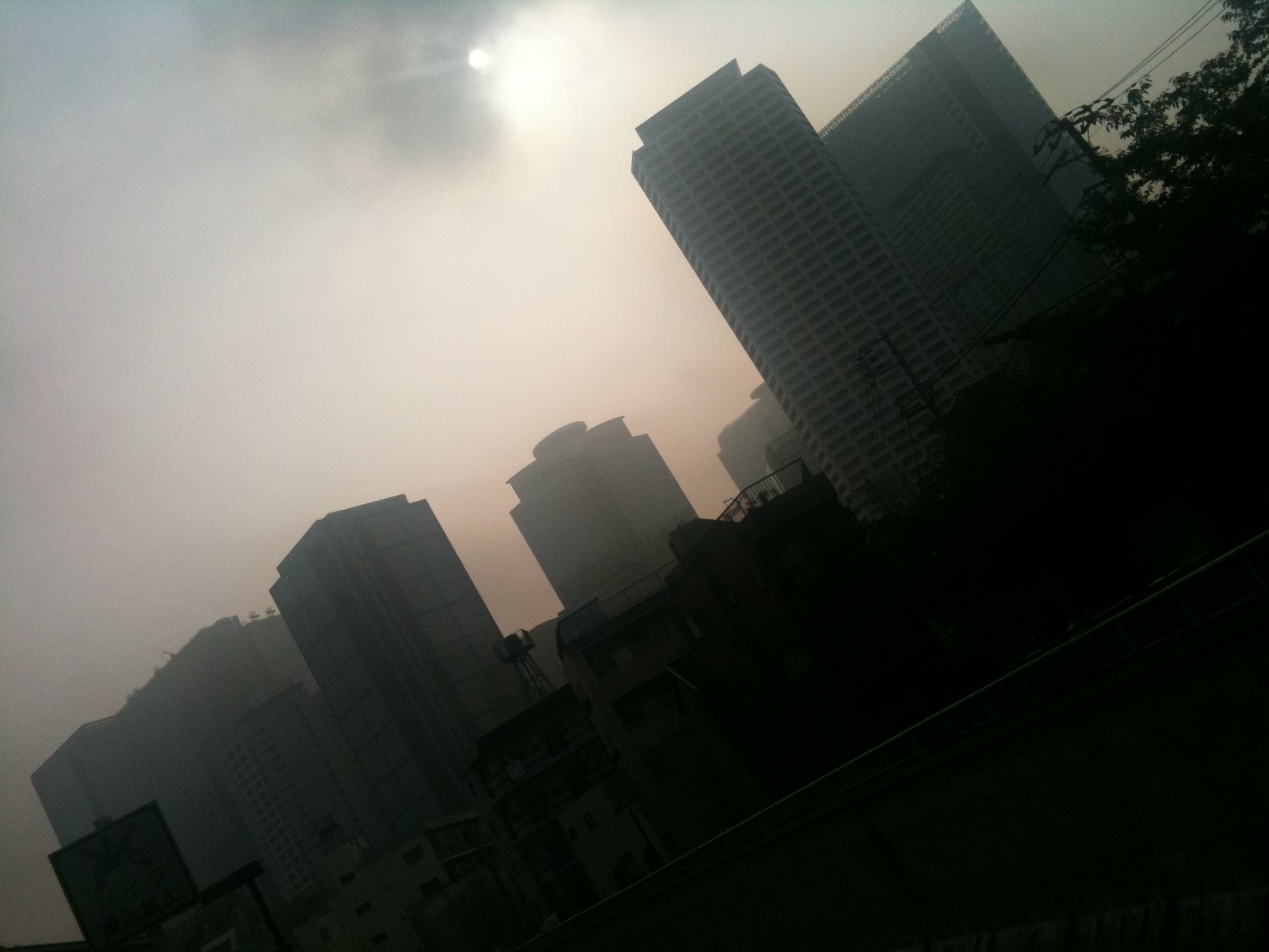 酒で目が曇ったかに見えた高層ビル、朝もやの新宿。